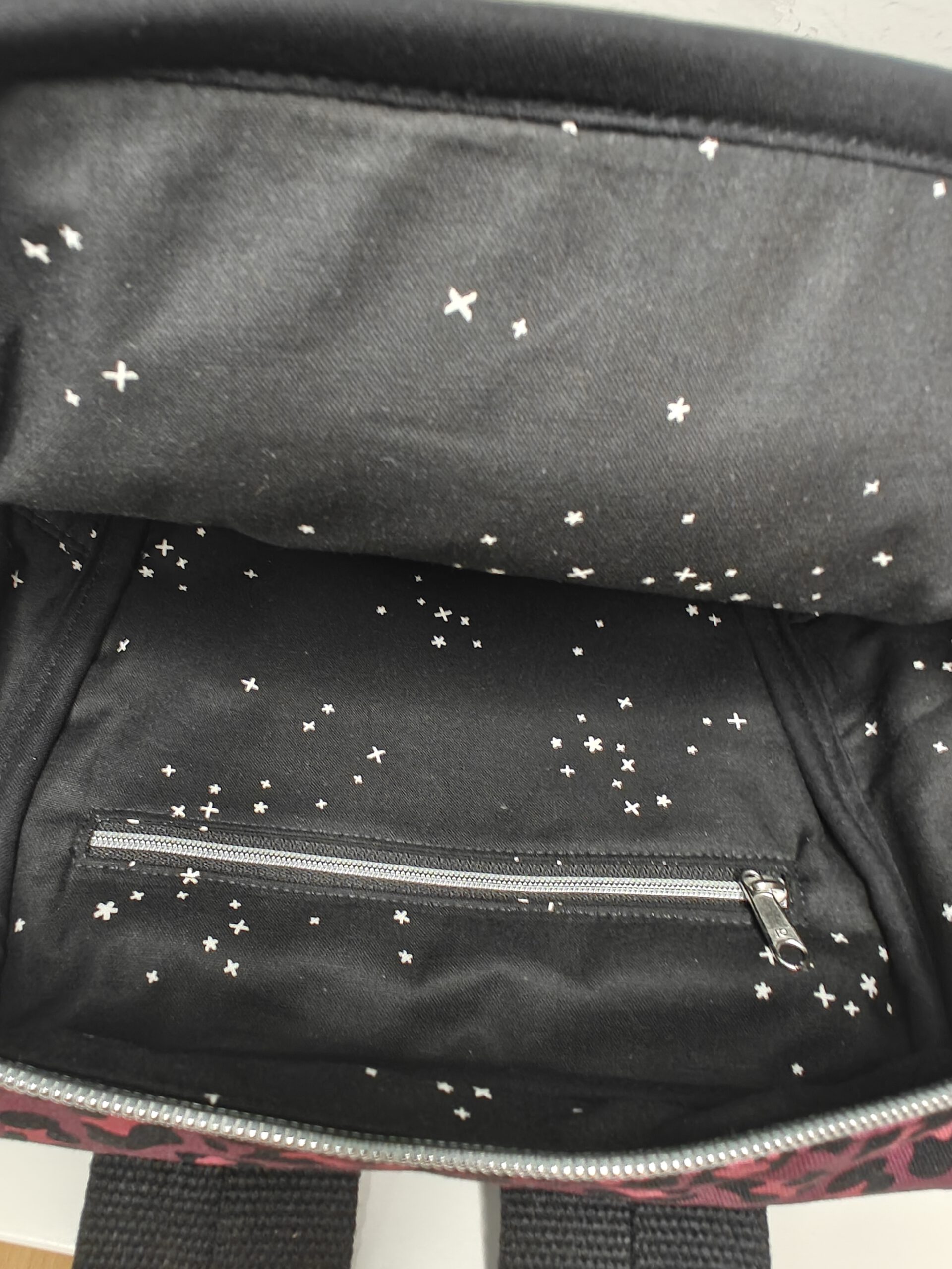 Die Haupttasche wird mit einem Reissverschluss verschlossen. Auf der vorderen Aussenseite befindet sich ein Reissverschlussfach. Auf der äußeren Rückseite befindet sich eine weitere Einstecktasche mit Reissverschluss, gut geeignet für ein Handy oder die Geldbörse. Innen befindet sich auf der Rückseite ein Reissverschlussfach.
