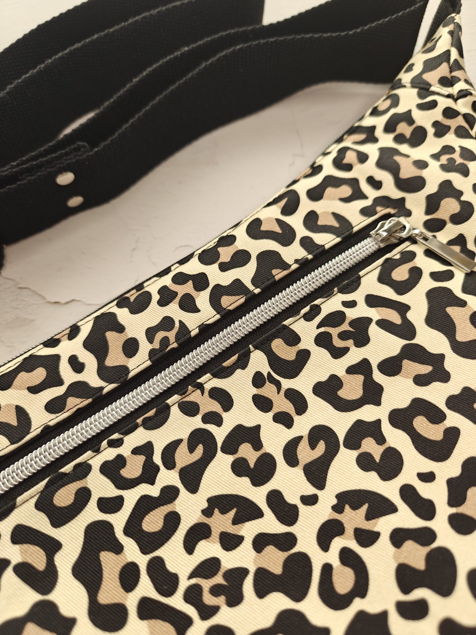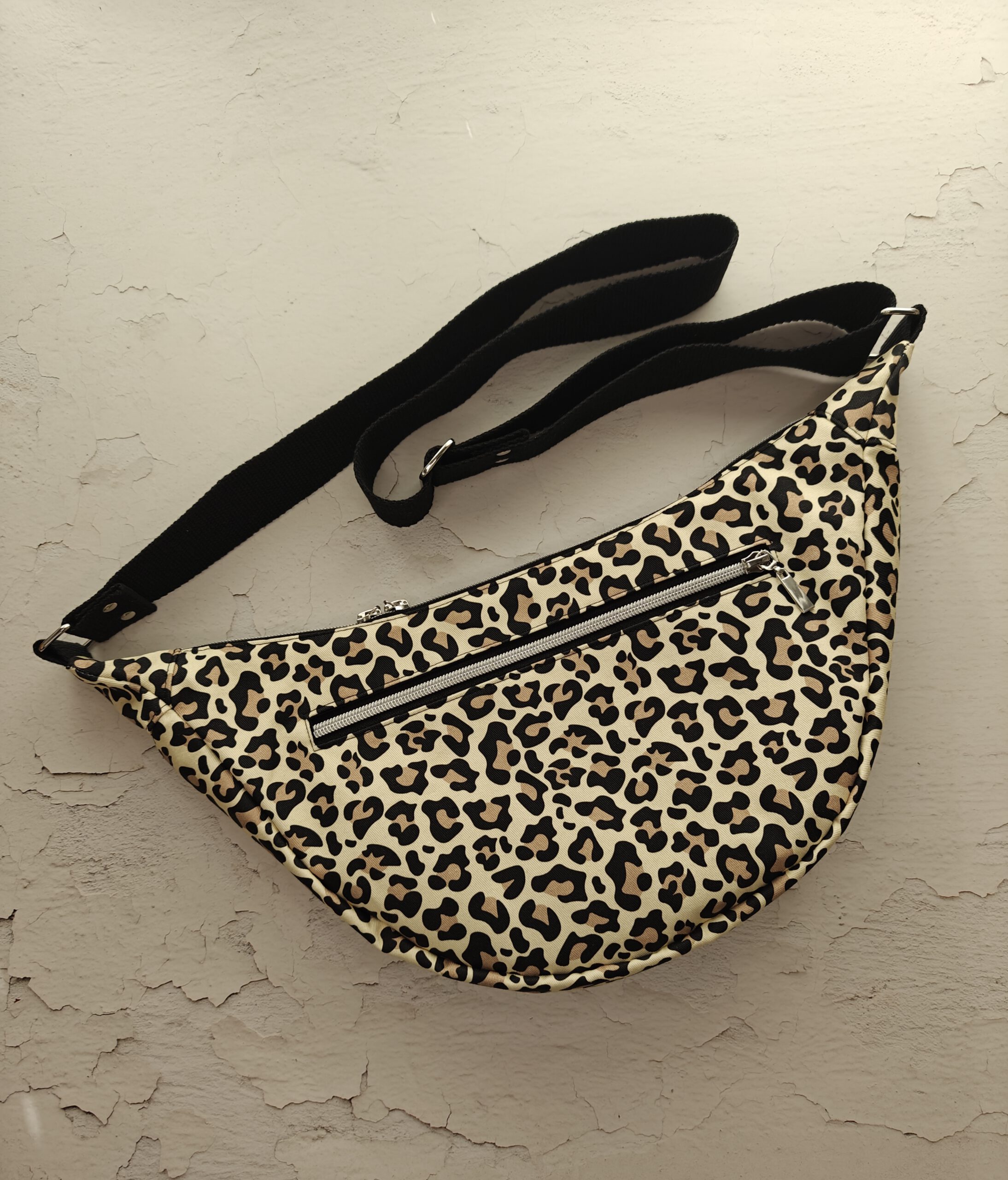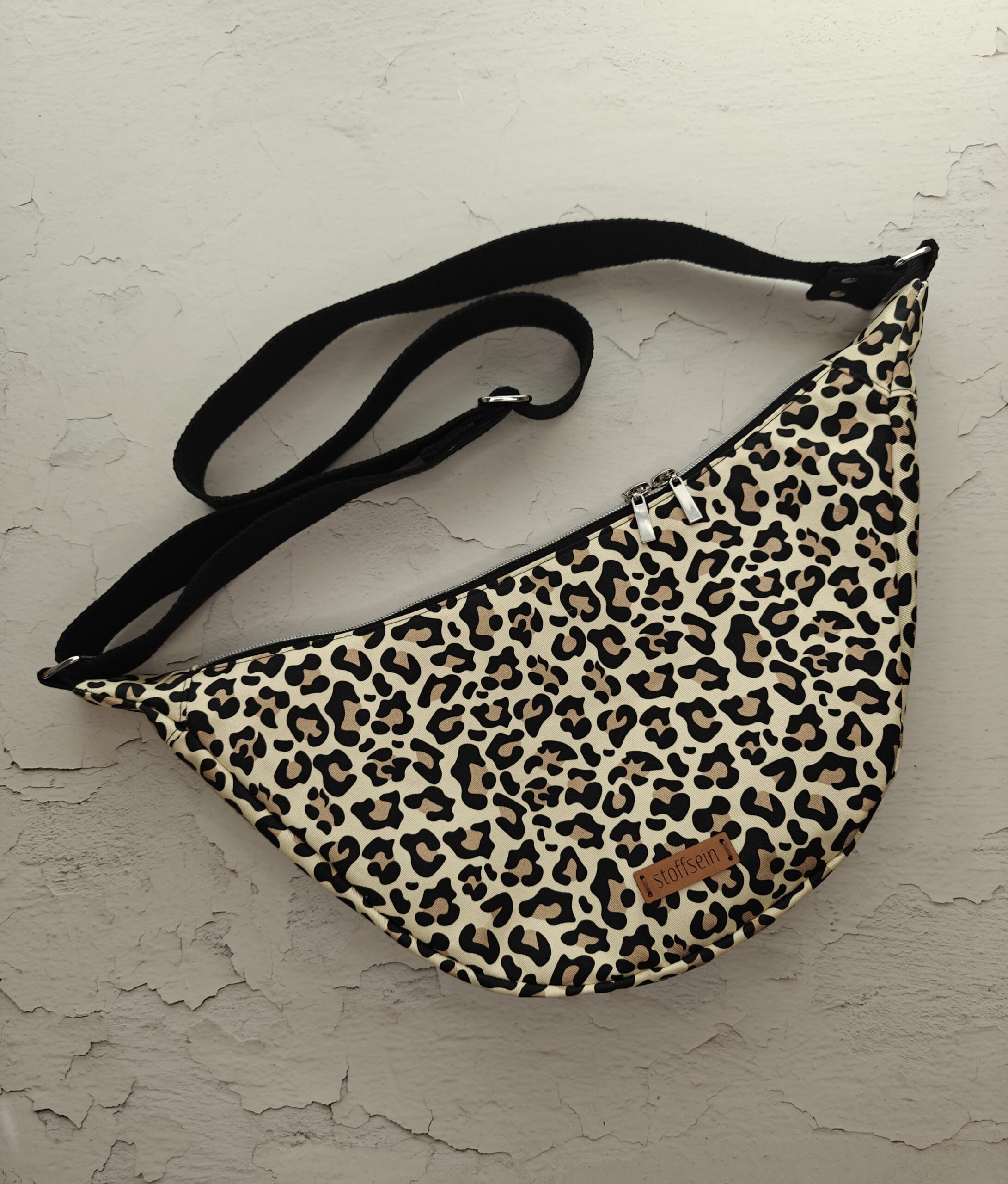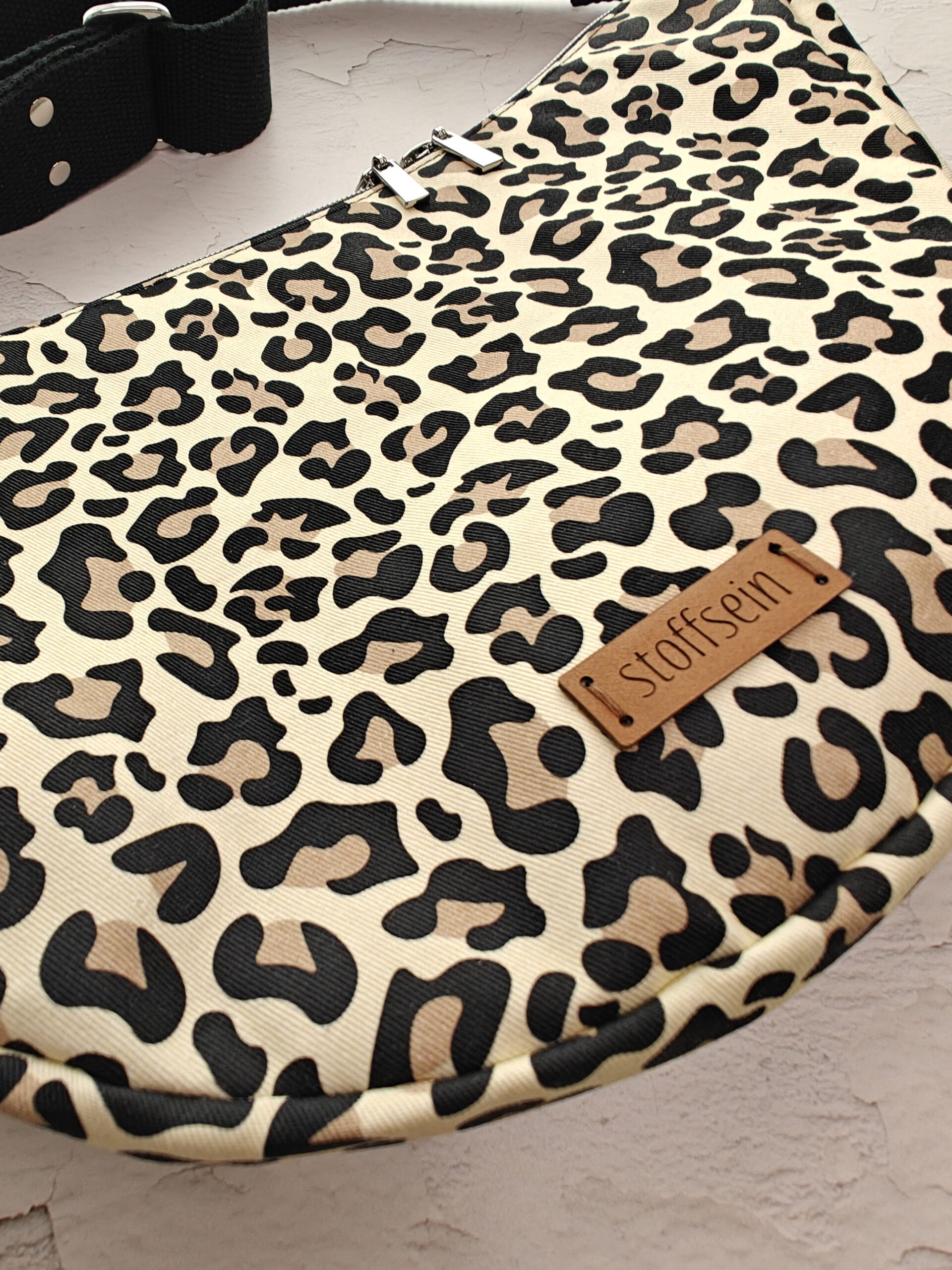 Umhängetasche im Halbmondstil aus dem schönen Leostoff und einem 4 cm breitem verstellbarem Gurtband in schwarz.