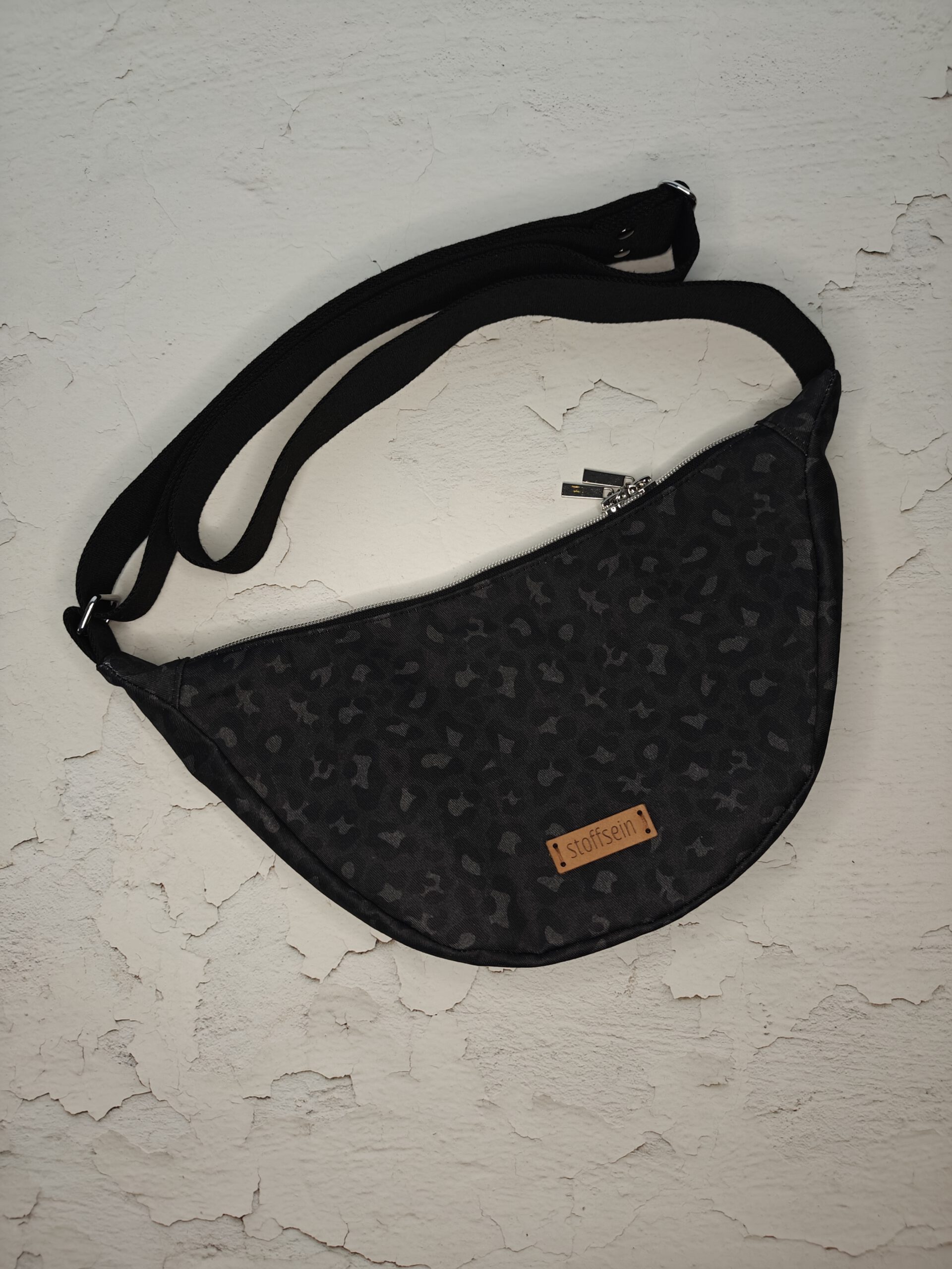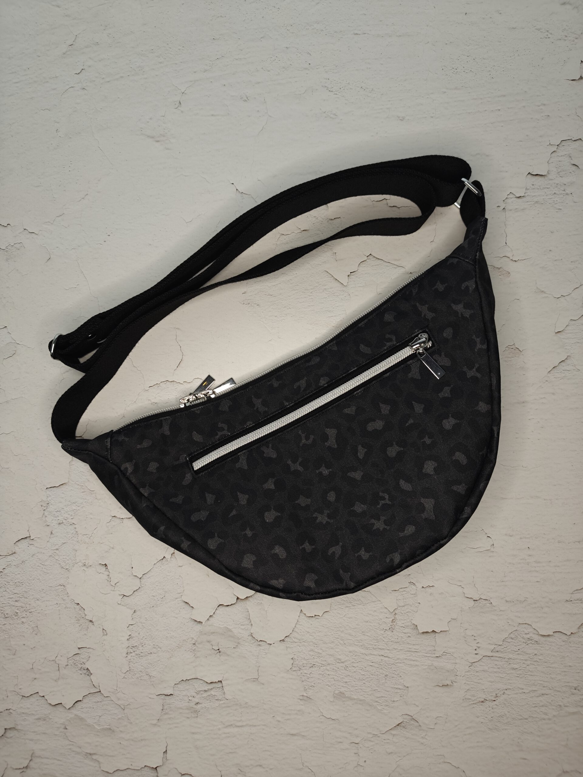 Umhängetasche im Halbmondstil aus dem schönen Leostoff und einem 4 cm breitem verstellbarem Gurtband in schwarz.