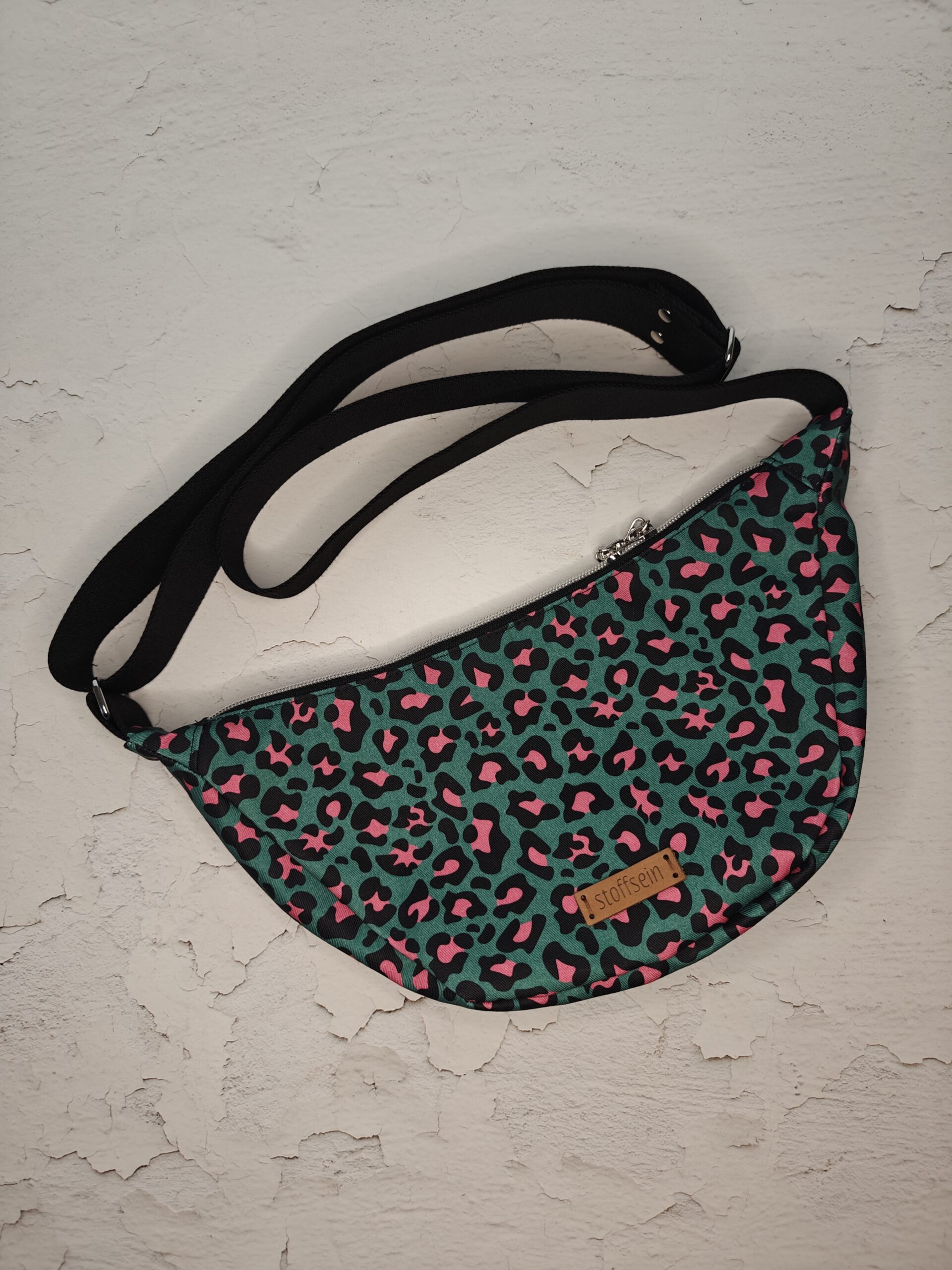 Umhängetasche im Halbmondstil aus dem schönen Leostoff und einem 4 cm breitem verstellbarem Gurtband in schwarz.