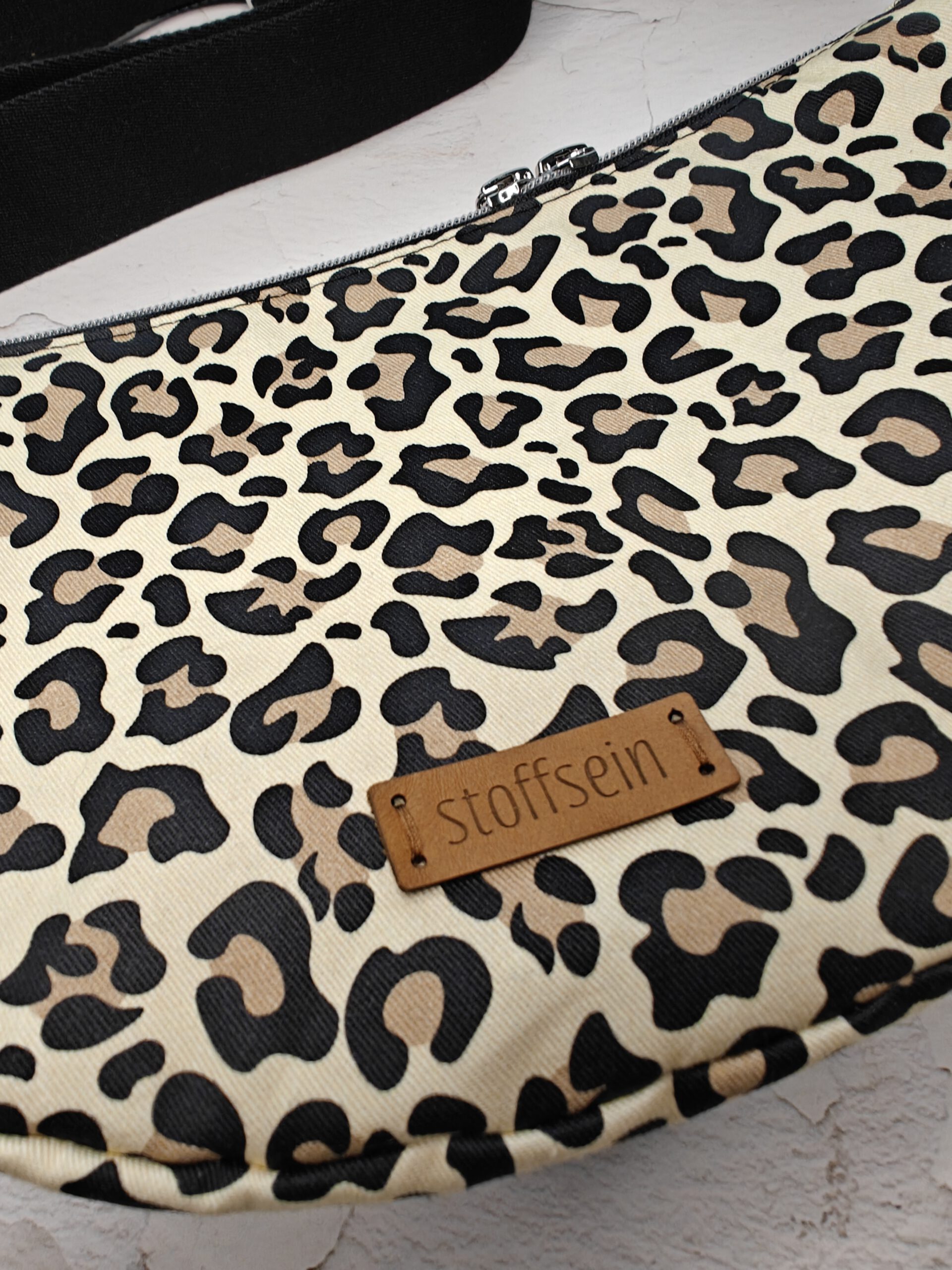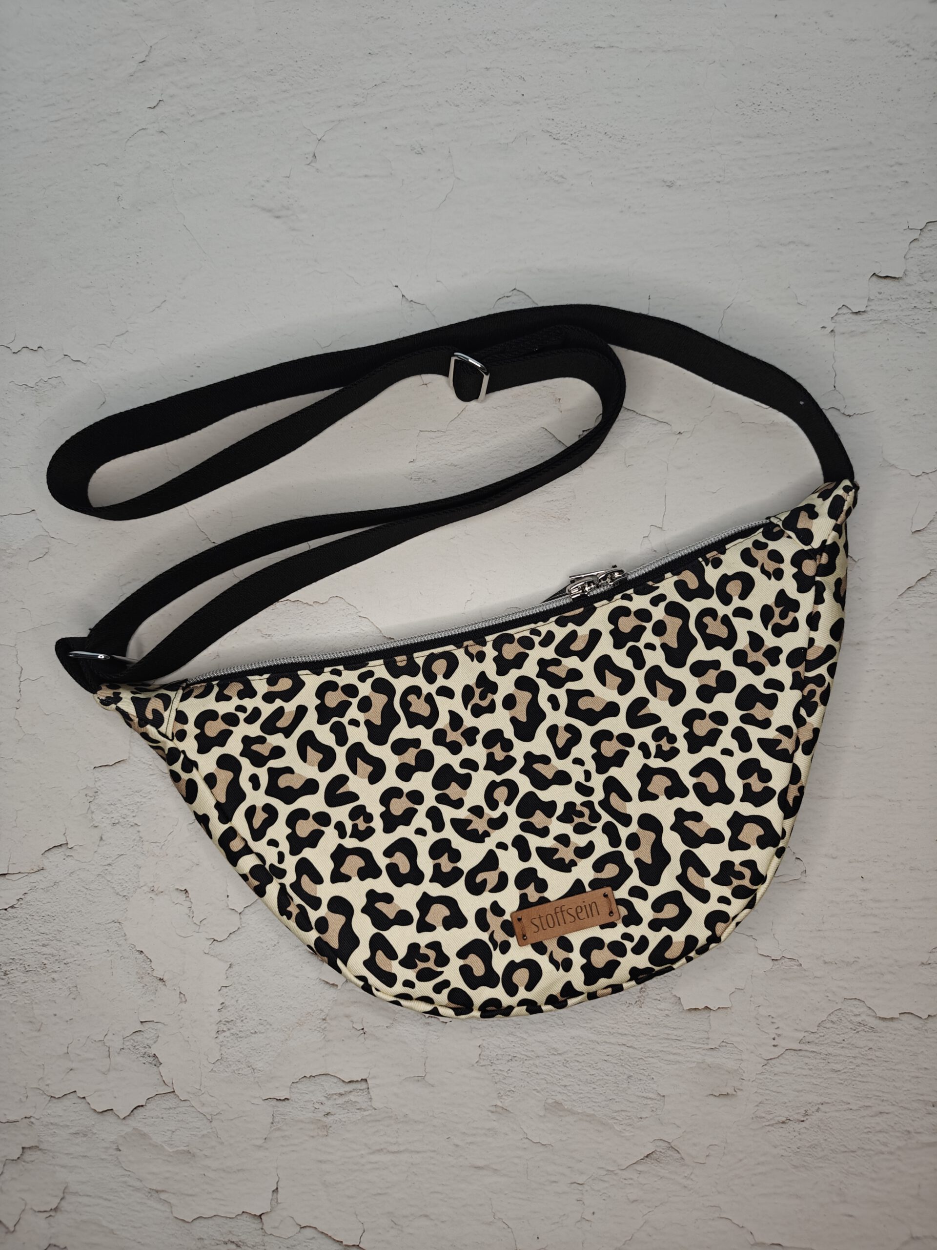 Umhängetasche im Halbmondstil aus dem schönen Leostoff und einem 4 cm breitem verstellbarem Gurtband in schwarz.